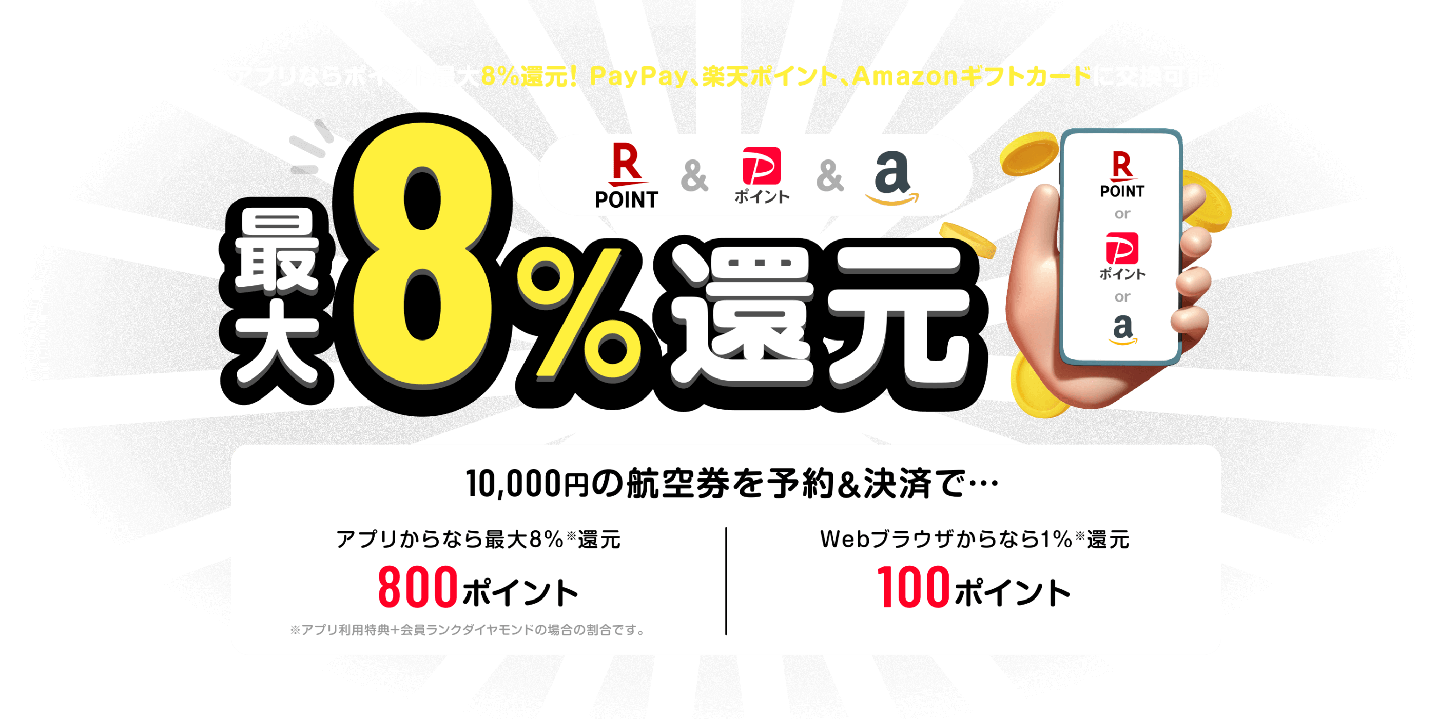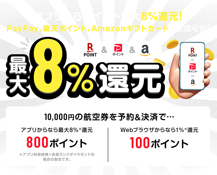 - 国内航空券:Webからご購入の会員様には航空券代金の1%、アプリからご購入の会員様には航空券代金の3%分のポイントを付与いたします。